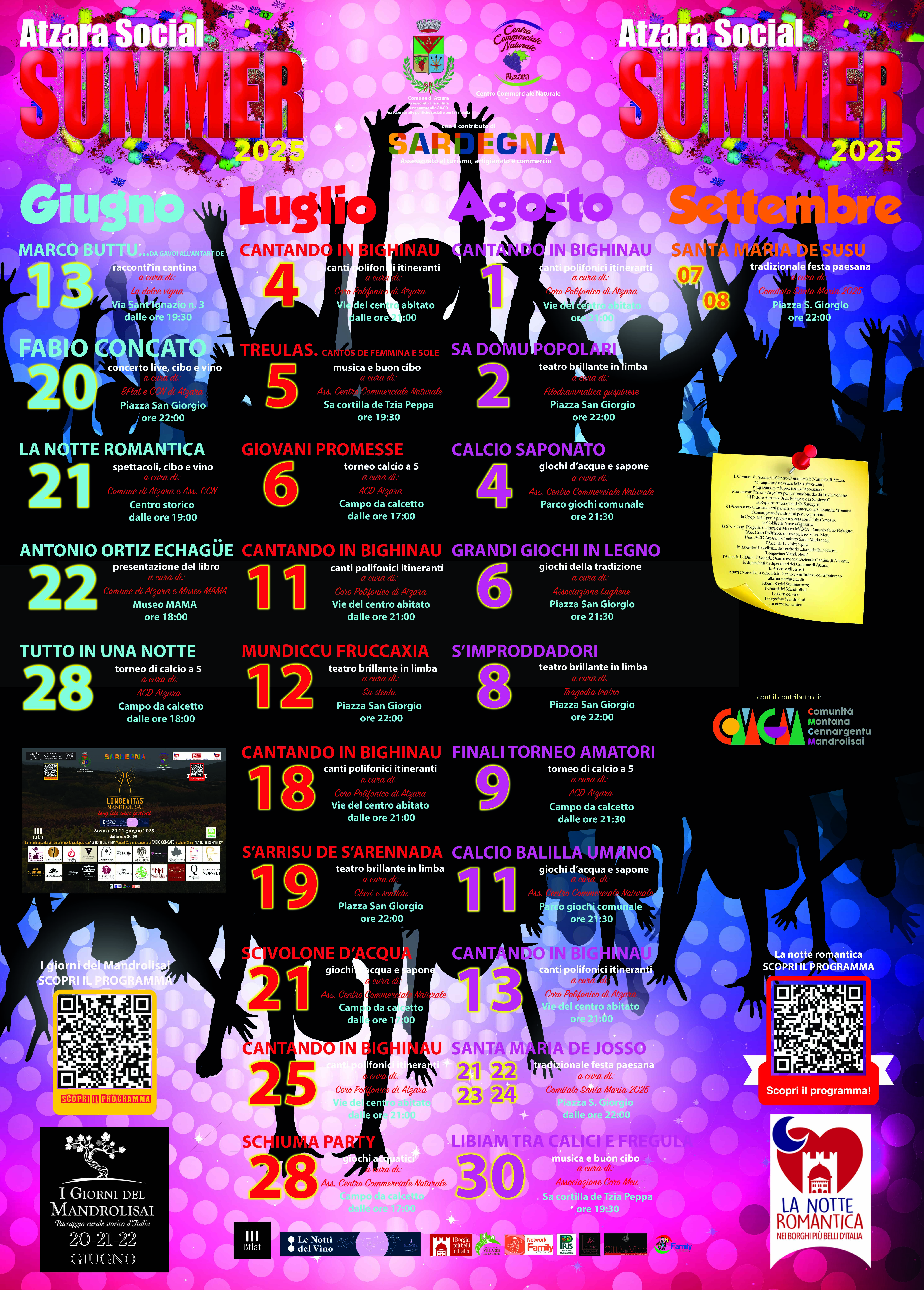 Sabato 21 giugno sarà la volta de “La notte romantica nei Borghi più Belli d’Italia”, manifestazione nazionale organizzata in tutta Italia e giunta alla sua decima edizione. La manifestazione è dedicata a tutta la famiglia con oltre 30 artisti che animeranno le vie del percorso, attività per bambini, concerti diffusi street food di qualità e l’imperdibile appuntamento con “Le notti del vino -Longevitas Mandrolisai, long life wine festival”, il festival dei vini della longevità con la partecipazione di 22 aziende vitivinicole. Saranno con noi le aziende: Fradiles, Famiglia Demelas, Vitivinicola Etzo, Vitivinicola Roberto Cadeddu, Cantina Pisu, Teneuta Mesanìa, Vitivinicola Manca, Fratelli Vacca Vitivinicola, Bingiateris, Vitivinicola Fulghesu Le vigne, Pranu, vigne del Mandrolisai, Agricola Su Connottu Mandrolisai, Cantina del Mandrolisai, Cantina Sassu, Agricola Giacu, Azienda Vitivinicola Trè Biddas, Su Binariu, IPA Agrario di Sorgono, Nicolò Meloni Azienda Agricola. Ospiti speciali, Cantina Li duni di Badesi, Quarto Moro di Sardegna, Cantine di Neoneli. Durante la serata sarà possibile degustare lo street food locale e i prodotti della iniziativa Coldiretti, "Campagna amica".