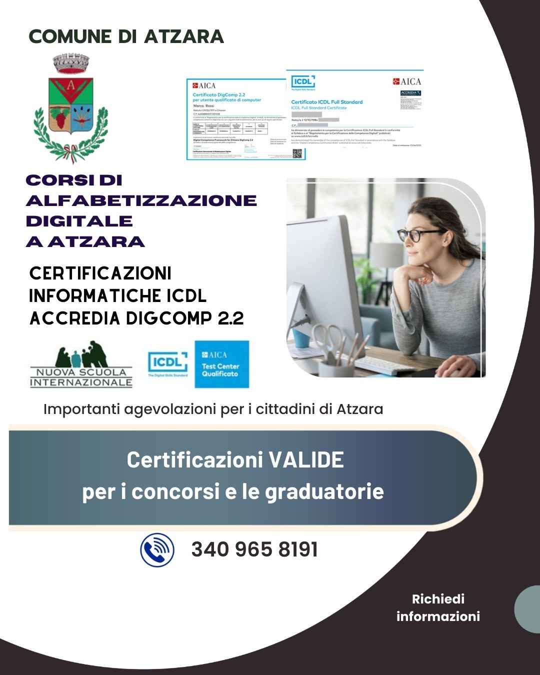 Si informano tutti coloro che intendono migliorare le proprie competenze digitali che il Comune di ATZARA in collaborazione con Nuova Scuola Internazionale dà la possibilità a tutti i cittadini residenti di acquisire o migliorare le competenze nel campo informatico, ma soprattutto di Attestare tali competenze con la CERTIFICAZIONE ICDL ACCREDIA valida come Certificazione di Alfabetizzazione Digitale (C.I.A.D.) ormai obbligatoria per graduatorie e concorsi.